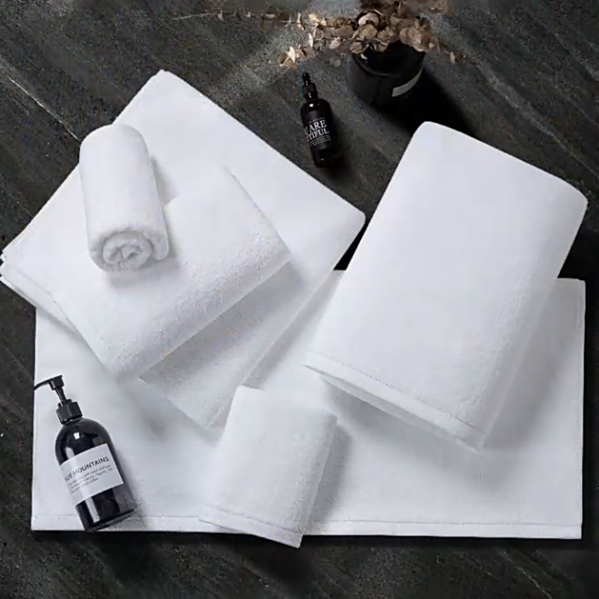 Hotel towels are towels for hotel rooms, generally white cotton towels with good quality. A regular hotel should have five towels: square towels, face towels, bath towels, floor towels and bath towels.